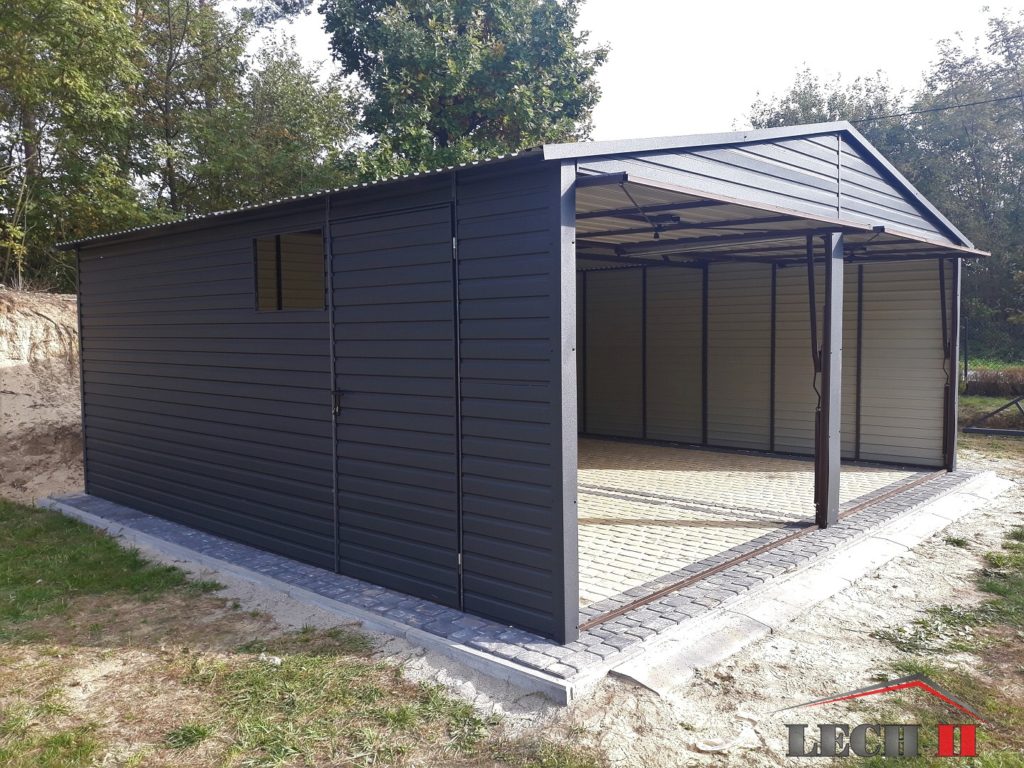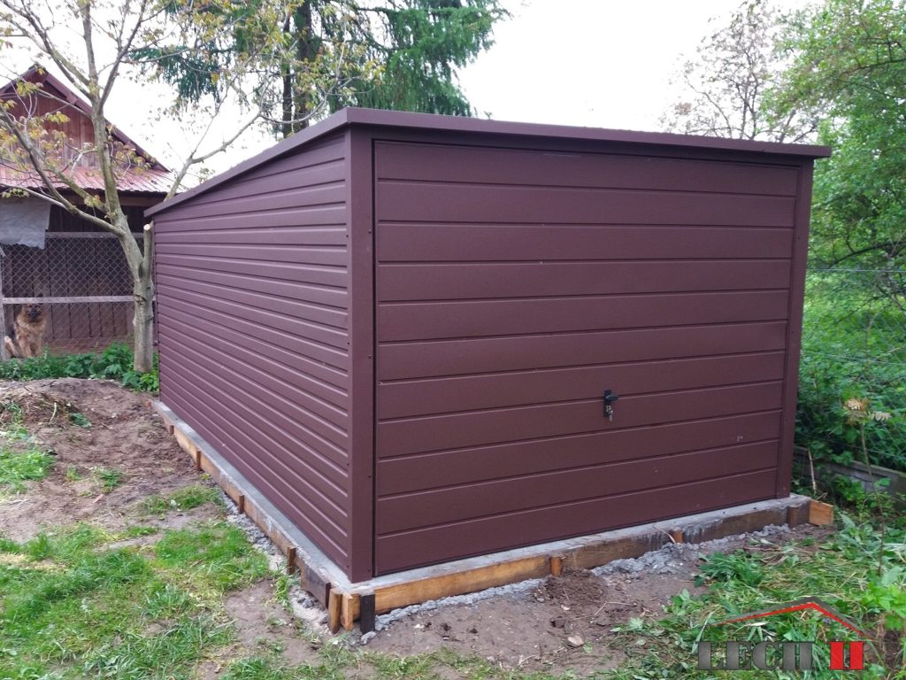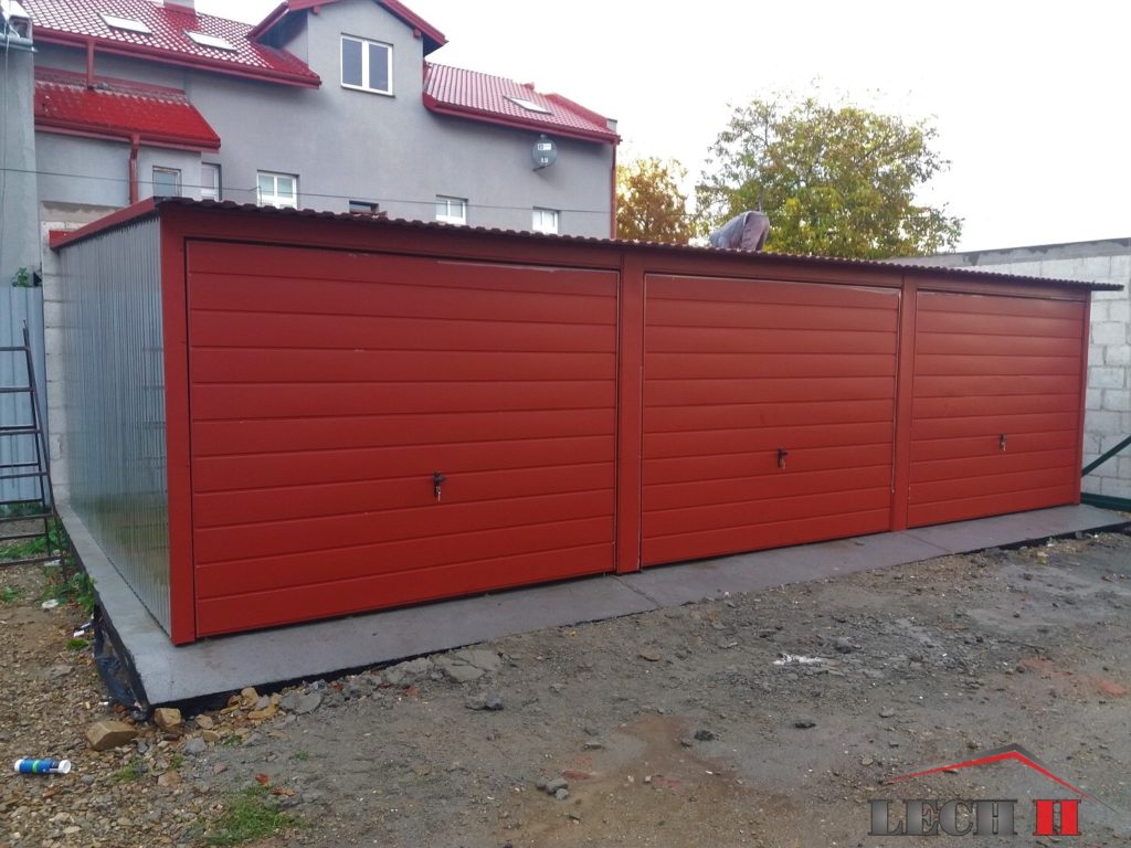 Konstrukcja garażu wykonana jest z kątowników oraz ceowników giętych na zimno w przypadku zamówienia garażu w całości z blachy w trapezie poziomym konstrukcja jest wykonana z profili stalowych i ceowników. Konstrukcja pomalowana jest farbą podkładową. Całość obłożona jest blachą akrylowa w wybranym przez klienta kolorze z palety RAL. Przymocowaną do konstrukcji za pomocą nitów aluminiowych pod kolor blachy, którą został obłożony garaż.